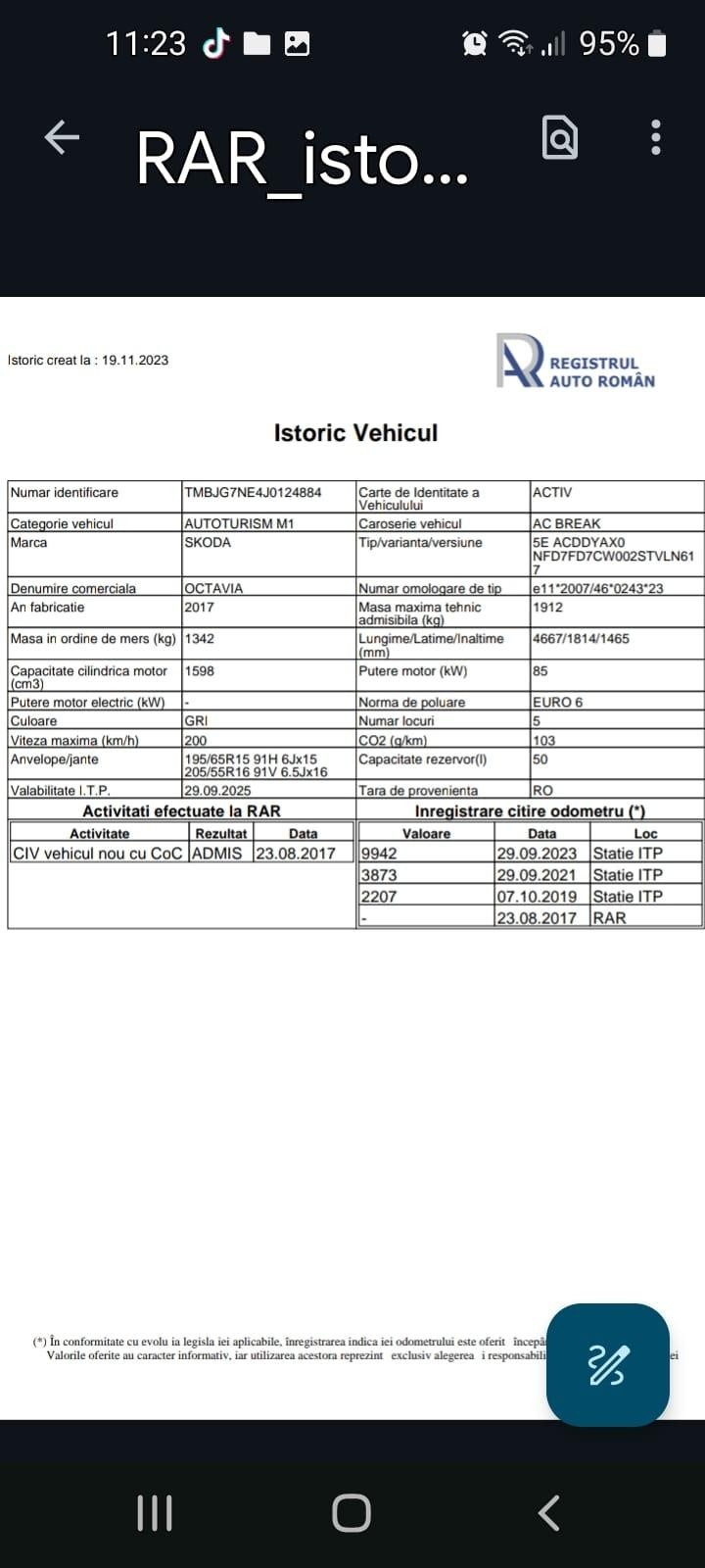 Vand Skoda Octavia (sasiu TMBJG7NE4J0124884), generatia III, euro 6 1,6 TDI automatica DSG an de fabricatie 2017 (facelift model 2019) cu 16000 km reali si service la zi ce se poate vedea aici in galeria foto: pozele ITP si poze schimburi facute. Masina a fost achizitionata initial in Romania de la reprezentanta Skoda Arad de catre cineva din familia mea din Timisoara pe persoana fizica, societatea mea comerciala fiind al doilea proprietar in prezent. Masina este inscrisa in circulatie si are RCA platit pe 2024 la Omniasig. Am tinut masina mai mult in garaj, efectiv am circulat putin si doar in oras. Sunt medic, stau central si am jobul si toate locatiile de interes aproape. Uleiul cu toate filtrele au fost schimbate in 16.08.2022 la 6687 km schimb facut impreuna cu o alta revizie periodica (se vede in poze). In 15.09.2023 s-a facut si schimbul de lichid de frana cu o alta revizie periodica la 9520 km. Inca se mai pot face cateva mii de km pana la schimbul urmator de ulei. Dupa cum se vede in tabelul cu istoric RAR toate ITP -urile din 2 in 2 ani sunt facute la termen unde apare si nr real de km parcursi. Ultimul ITP este valabil pana in 29.09.2025. Momentan ma atentioneaza in bord ca peste o luna e necesar un control service periodic: se refera la directie, frane, suspensie, lumini (revizia periodica). Spre deosebire de alte masini de aceeasi generatie Skoda are geamurile laterale spate si luneta ionizate (fumurii) din fabrica iar parbrizul fata, luneta spate si geamurile laterale stalpi spate sunt cu rezistenta degivrare, se dezgheata din buton si nu trebuiesc curatate iarna. Cauciucurile de pe masina sunt cele originale mixte iarna/vara si sunt impecabile la 16000 km, rulate corespunzator. Gentile din aliaj sunt si ele cele originale skoda si nu au nici o mica zgarietura. In portbagaj exista roata de rezerva, crik si cheie de roti (toate neutilizate). Bateria a fost schimbata in 4.05.2023 si este inca in garantie (exista actele de garantie). Presurile interioare sunt de cauciuc si originale de la Skoda. Masina nu are Ad Blue!!! Pentru cei interesati de o asa masina accept cu mare placere teste sau verificari oriunde doriti dumneavoastra. Masina nu a suferit nici un incident rutier, se poate verifica si la reprezentanta Skoda si pe siteuri profesionale. Are o singura chemare la reprezentanta Skoda in garantie sa modifice ceva soft (erori de fabrica). De retinut ca in prezent masina e inmatriculata pe firma neplatitoare de tva. Starea de functionare e perfecta iar masina arată impecabil/intacta si la interior și la exterior, nu prezinta zgarieturi iar uzura este 0 la asa putini km. Cine vrea o masina mai speciala, ca noua si cu motorul bun in 4 pistoane (traditional) si economic (5 l/100 in oras) de 1,6 de la audi si fara Ad Blue face toti banii. Din cate masini am avut a fost cea mai economica si fara nici o problema. Este singura mea buna ocazie de masina luata la putini km si nu achizitionata scump, la pret intreg de reprezentanta cum am contractat eu mereu in leasing in ultimii 25 de ani.